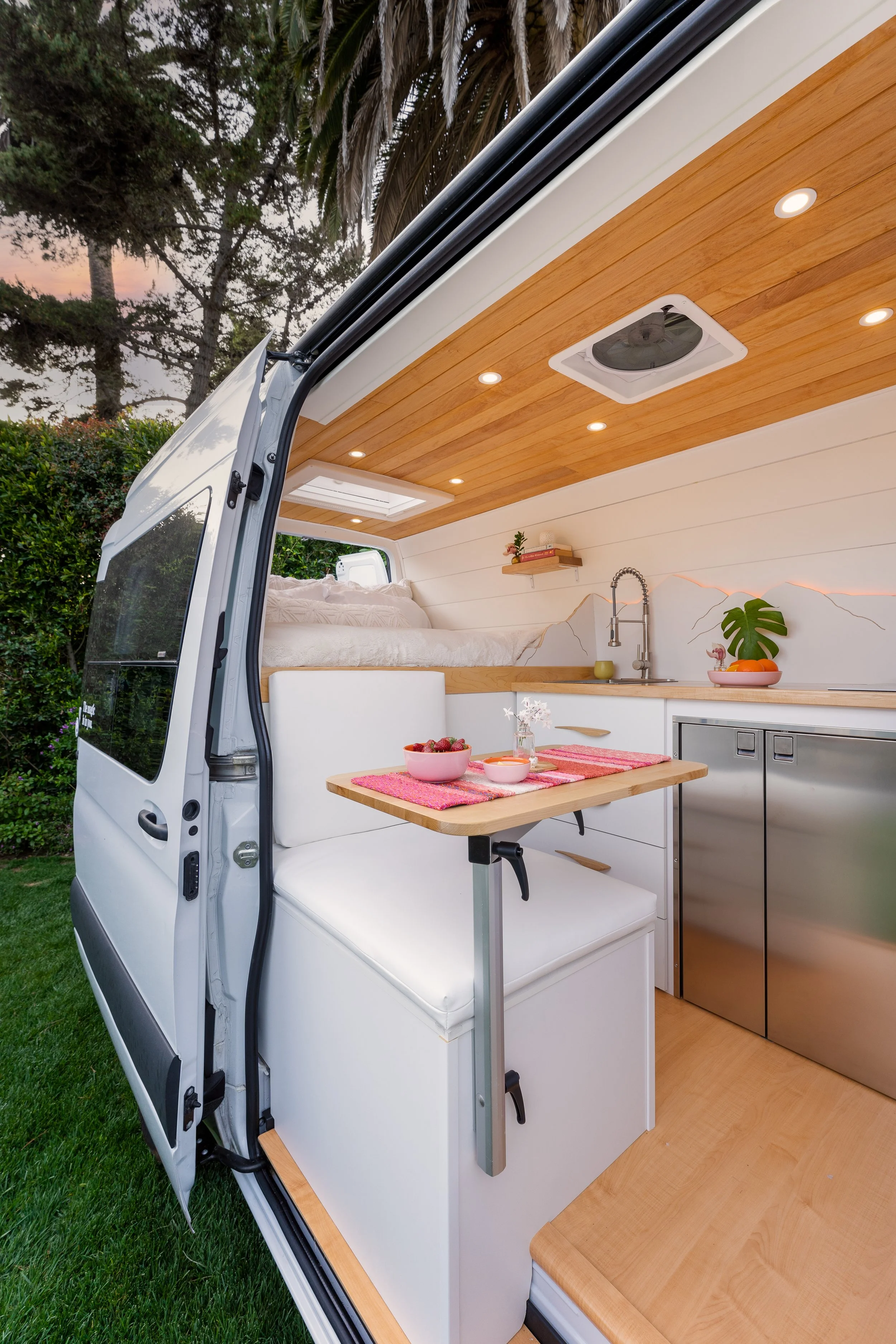 We are passionate about designing and building conversions that are not only among the most aesthetically beautiful vans on the market, but that also come equipped with every amenity needed for true off-grid adventure. With 55 gallons of fresh water, efficient power systems, and premium components throughout.